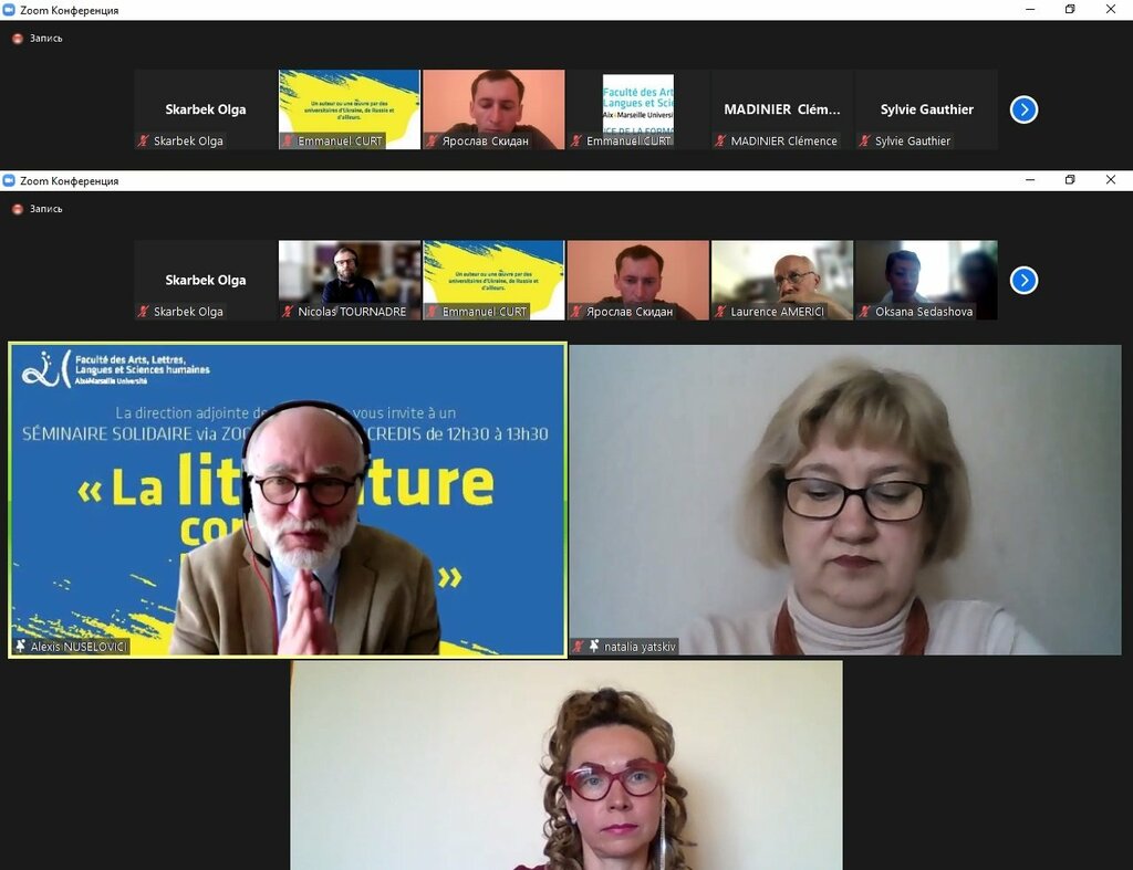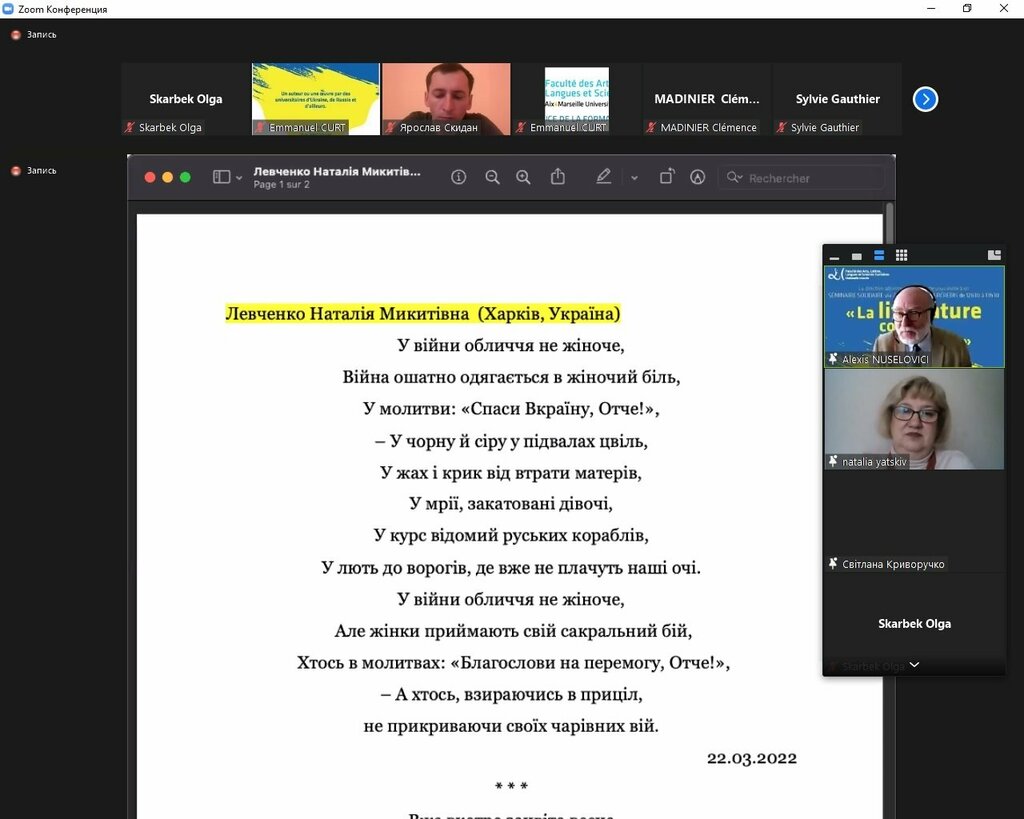 Викладачі кафедри французької філології ПНУ взяли участь у роботі семінару «Література проти війни», організованому в рамках солідарності французьких вчених з університетами України, організованому факультетом мистецтв та гуманітарних наук університету Екс-Марсель (Faculté des Arts, Lettres, Langues et Sciences humaines Aix Marseille Université). Відбулося обговорення поезії Н. Левченко «У війни обличчя не жіноче» у перекладі Наталії Яцків, своїми травматичними враженнями, спровокованими російською агресією поділилася завідувачка кафедри зарубіжної літератури та слов᾽янських мов Харківського НПУ професорка Світлана Криворучко.