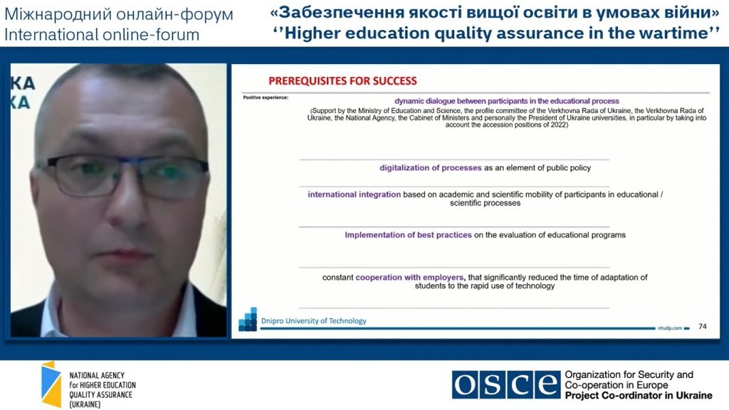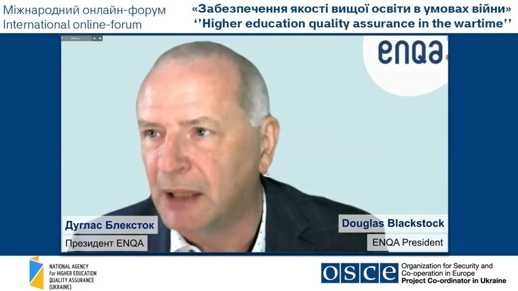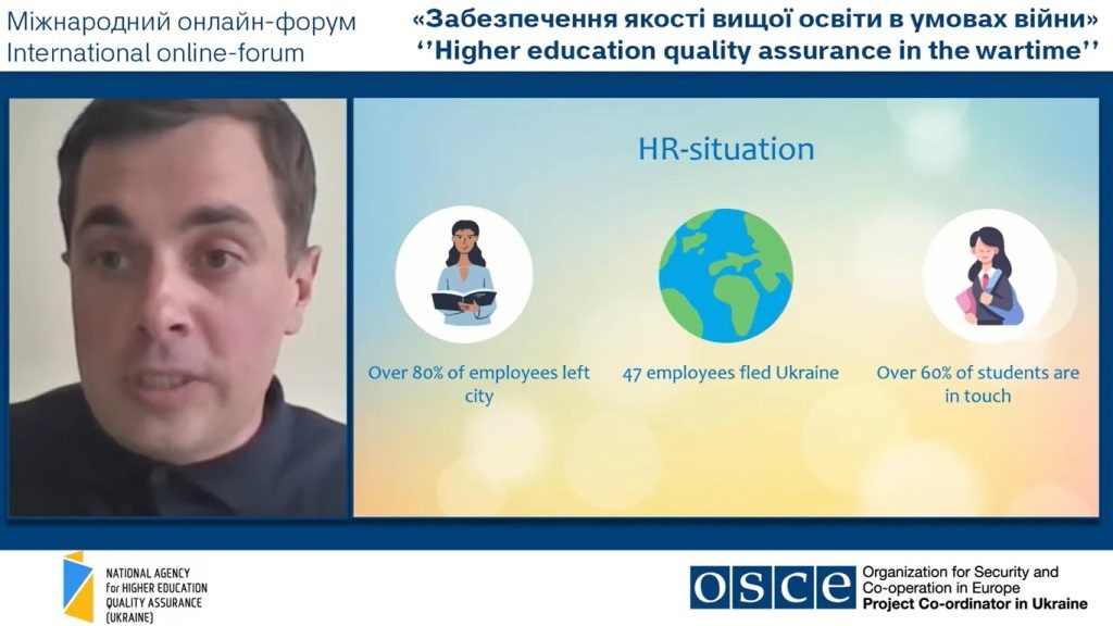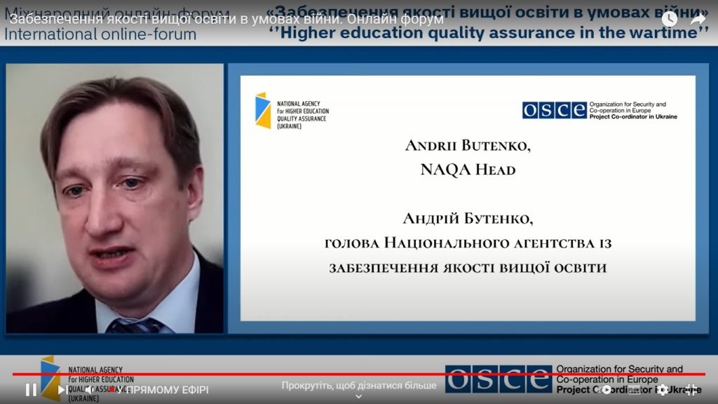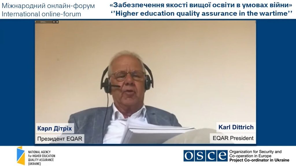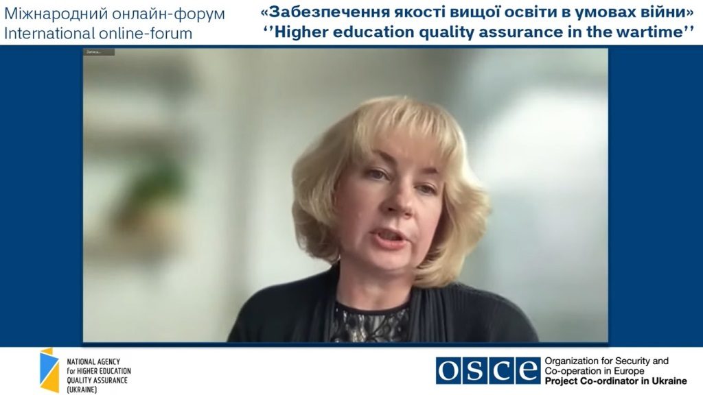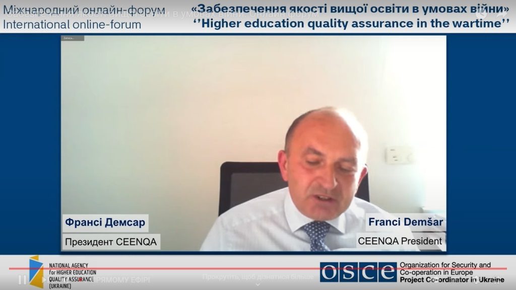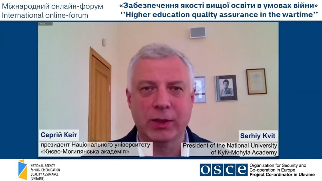 Як забезпечити якість вищої освіти в умовах війни? Про це майже три години дискутували представники з України та ще понад 30 країн світу, 29 агентств з забезпечення якості освіти, керівники відомих у світі асоціацій – ENQA, EQAR , INQAAHE, CEENQA під час Міжнародного онлайн-форуму «Забезпечення якості вищої освіти в умовах війни».