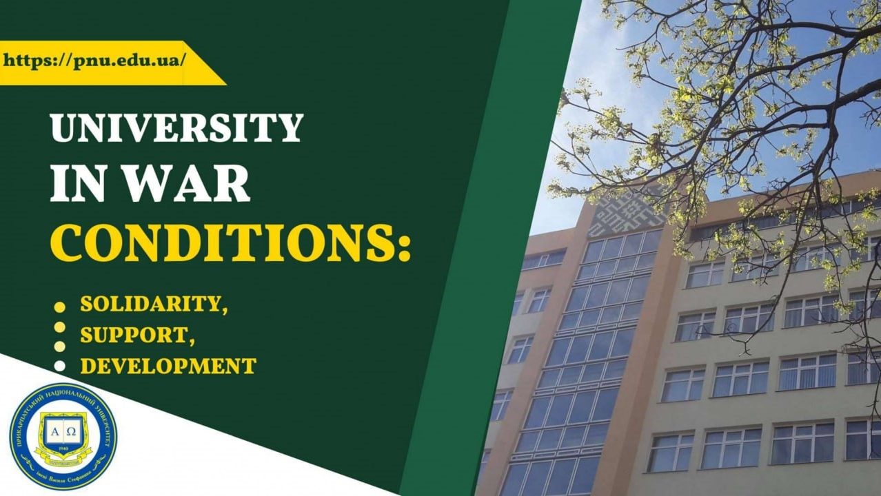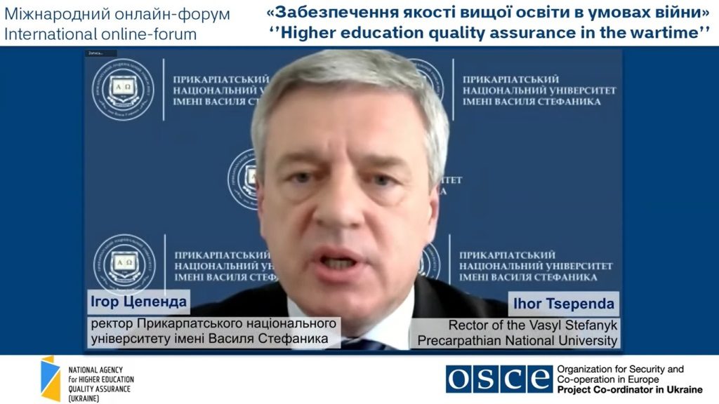 Ректор Прикарпатського університету імені Василя Стефаника Ігор Цепенда свої роздуми на тему «УНІВЕРСИТЕТ В УМОВАХ ВІЙНИ: СОЛІДАРНІСТЬ, ПІДТРИМКА, РОЗВИТОК» розпочав з розповіді про допомогу, надану ПНУ університетам, які постраждали від російської агресії. Вже у перший тиждень війни Прикарпатський університет сформував онлайн платформу для студентів тих університетів, які не могли продовжити навчання внаслідок російської агресії, щоб вони у рамках внутрішньої академічної мобільності продовжили навчатися за своєю освітньою програмою.