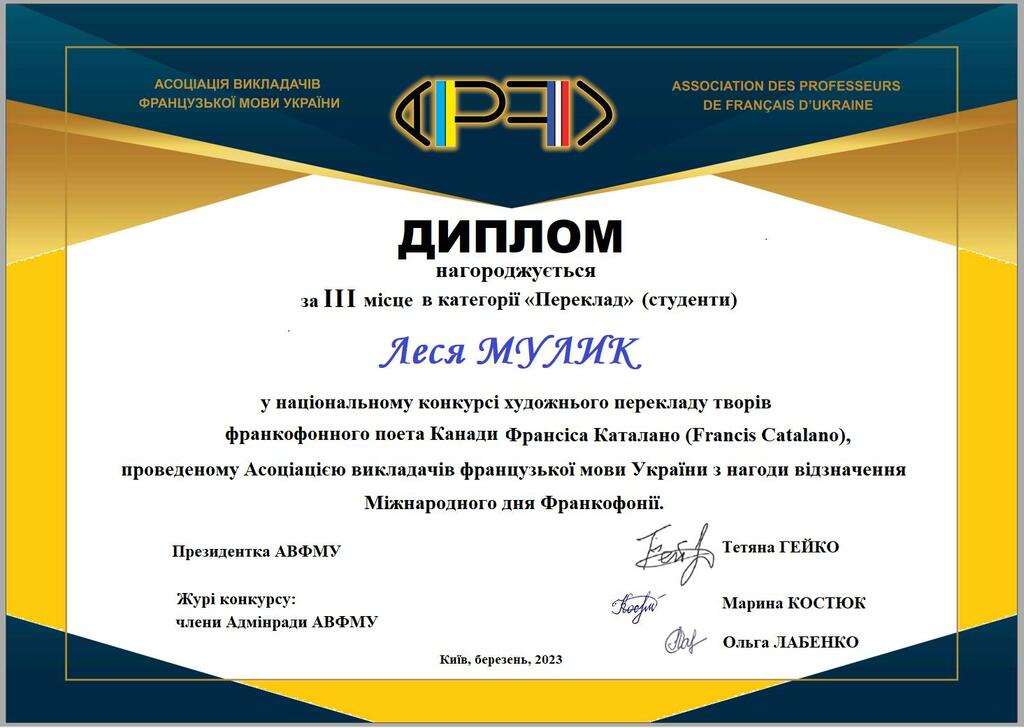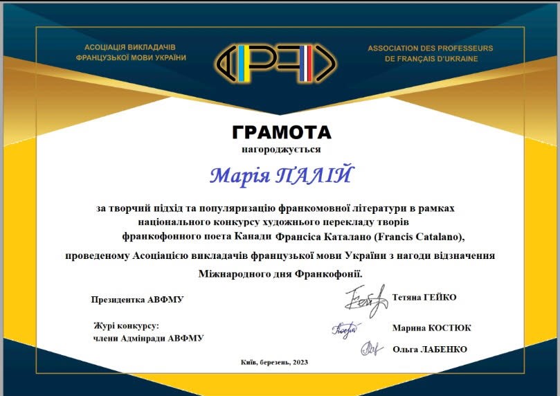 Вітаємо нашу студентку Лесю Мулик, призерку Національного конкурсу художнього перекладу франкофонних поетів Канади, яка здобула третє місце у номінації «Поетичний переклад». Вітаємо, ще одну нашу студентку Марію Палій, яка була відзначена особливим призом конкурсу за творчий підхід до перекладу.