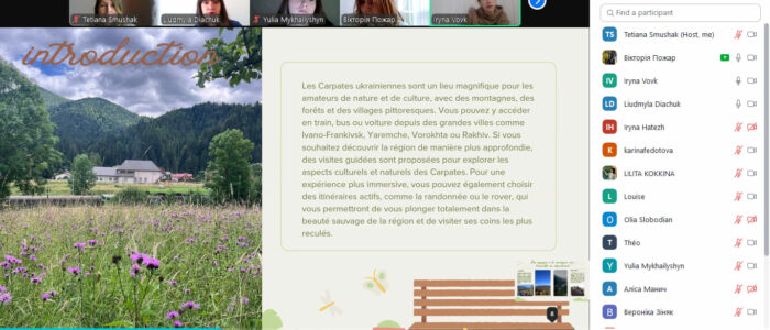 Під час заняття студенти з України розповідали французькою мовою про історію, архітектуру, відомі місця та культурні події Івано-Франківська та Одеси. Бельгійські студенти, у свою чергу, представляли Монс, його визначні пам’ятки, традиції та особливості місцевого життя українською мовою. Такий обмін сприяв не лише вдосконаленню мовних навичок, але й розвитку культурної обізнаності та розширенню світогляду. Завдяки цьому заняттю учасники могли попрактикувати іноземну мову в реальних умовах, познайомитися з новими друзями й дізнатися більше про країну та місто, культуру яких вони вивчають.