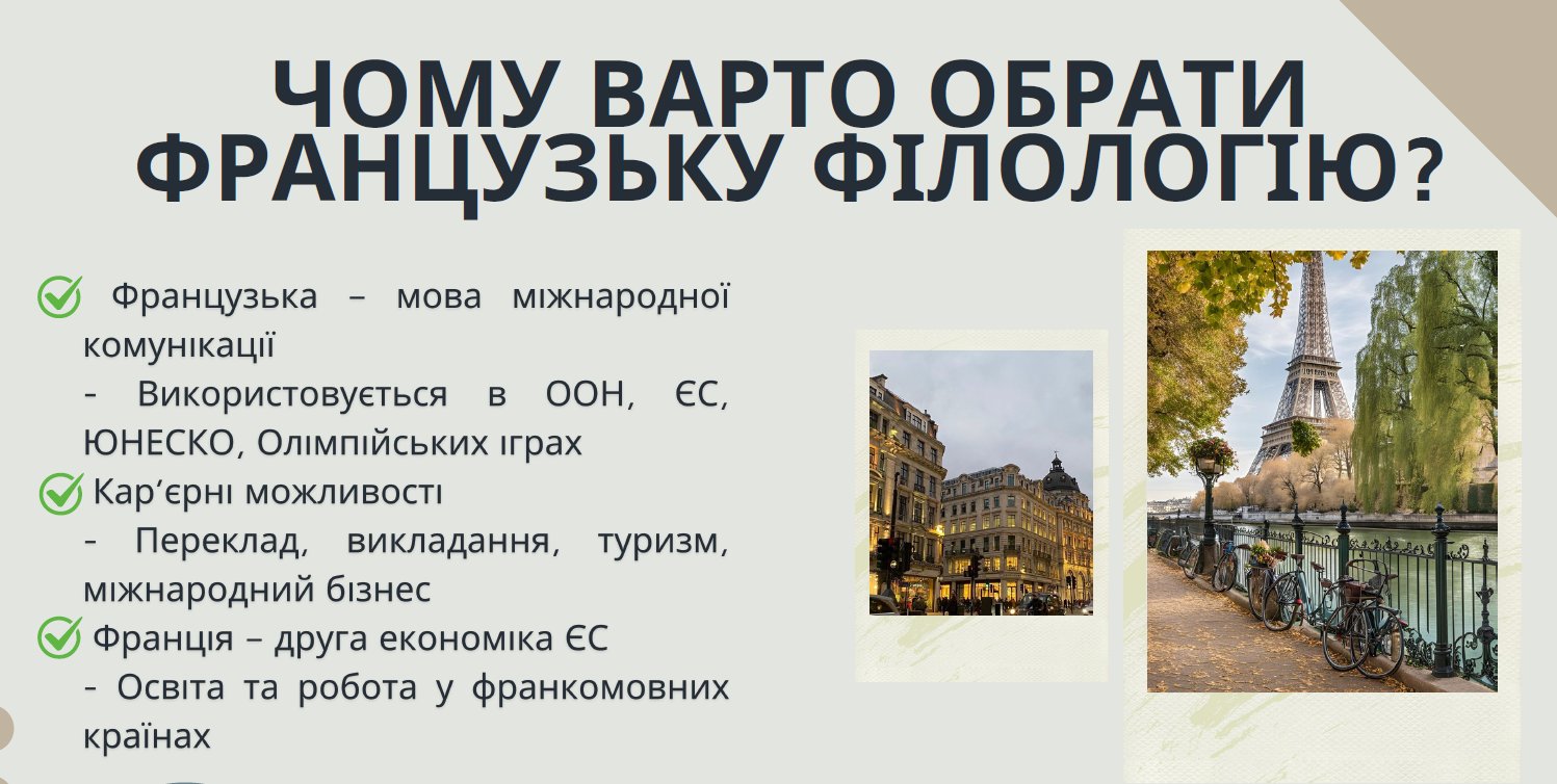 12 березня 2025 студенти-практиканти Тетяна Васильківська та Марія Палій кафедри французької філології факультету іноземних мов Прикарпатського національного університету імені Василя Стефаника, під керівництвом Наталії Луцик, Мар’яни Ковбанюк провели профорієнтаційний захід для учнів Івано-Франківської Гімназії №2.