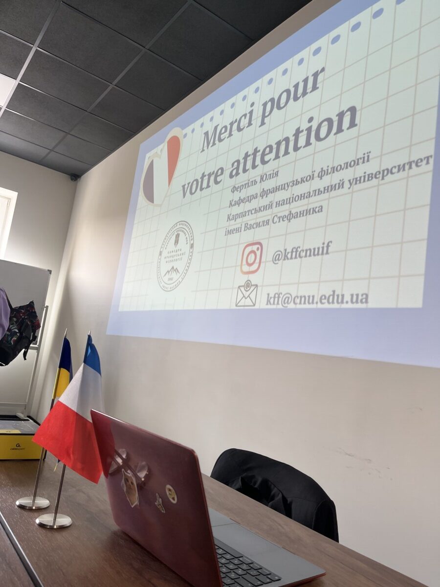 У межах заходу учасники мали можливість зануритися у світ та традиції Франції, її ментальність, культурні символи та мовні особливості . Аспірантка, ст. лаборант кафедри французької філології Карпатського національного університету імені Василя Стефаника Фертіль Юлія поділилася маловідомими й цікавими фактами про французьку мову, зокрема про її статус у світі, вплив на міжнародну дипломатію та роль у формуванні європейської культурної спадщини .